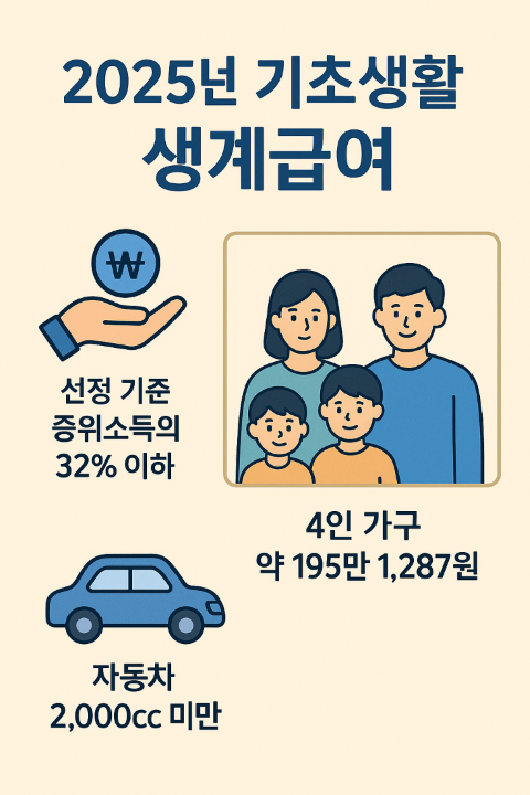 - 2025년부터 생계급여 수급 대상이 되는 **소득 인정액(실제 소득 + 재산 환산 소득 등)**이 기준 중위소득의 32% 이하로 변경되었습니다.